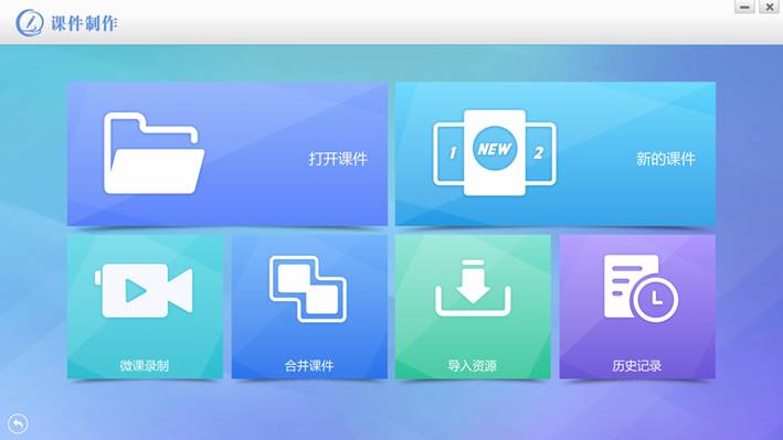 使用教师账号登录Windows客户端,选择“课件制作”进入。除了打开、新建、历史记录等常用功能外,同时提供屏幕录制微课的工具、合并课件以及导入资源的辅助工具。