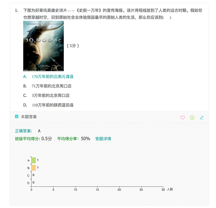 点击“详情”,展开该即时互动试题的答题详情,教师可直观查看每一个投票结果有几位学生投选。